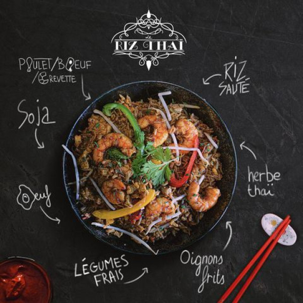 Riz sauté, herbes thaï, légumes et oeuf et viande au choix.