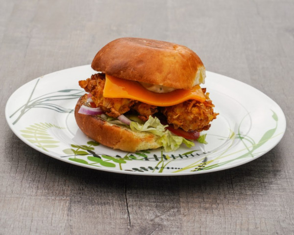 Pain brioché maison, poulet pané aux corn flakes, salade, tomates, oignons rouges, bacon de boeuf, double Cheddar affinage 7 mois et sauce secrète du chef. Servi avec frites belges et 1 boisson 33 cl au choix.